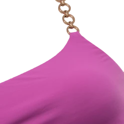 Full top with a single adjustable strap with 24k metal ring details. In a vibrant pink tone is a super feminine style and your next getaway companion