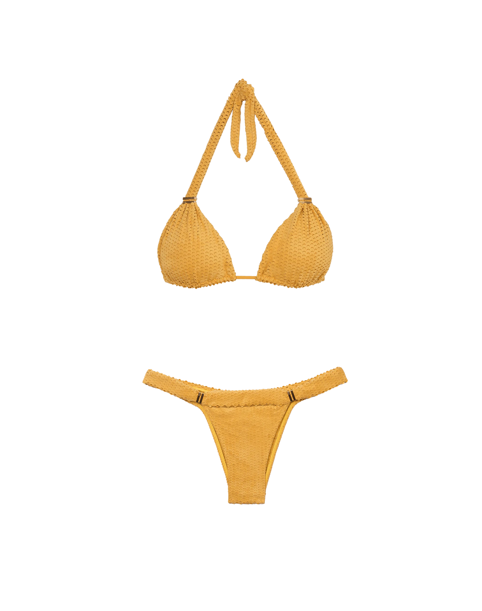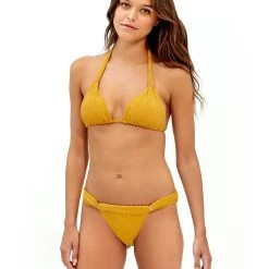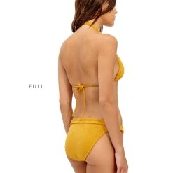 Traditional signature foldover bikini bottom in a handmade watercolor print for added texture and sliding gold hardware for customizable coverage. Ideal for any bodice.