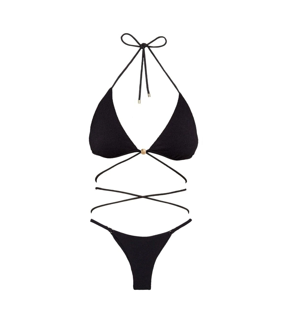 Classic underwear bikini bottom in a pale blue exclusive crepe fabric. This bottom molds to your body for a low rise eye- catching fit, wear at your natural waistline or higher on the hip for a high leg fit. This piece includes subtle 24K gold plated ring detailing on each side, a well as the ViX logo in back.