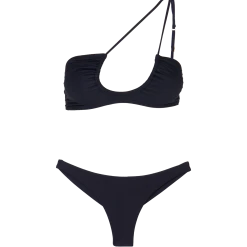 An unique top that will not only give you compliments but also no tan lines. The straps loop to one side and tie in back for a modern cut-out top.