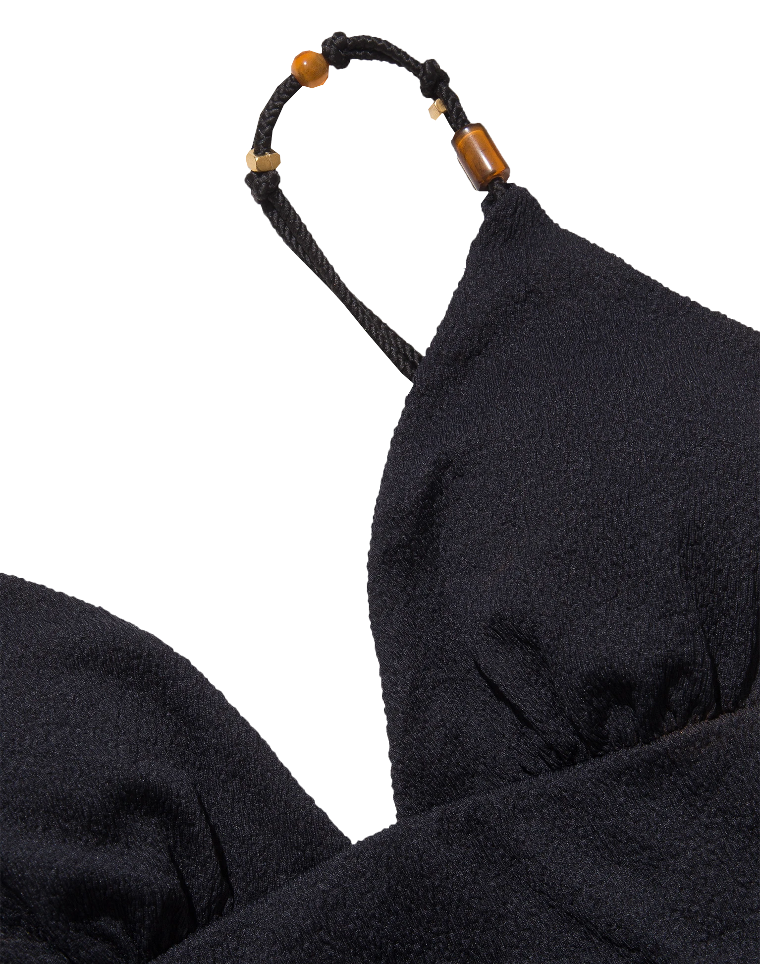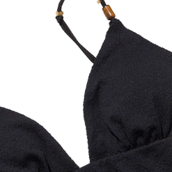 Triangle shape at the top and adjustable parallel straps made of elastic rope in the same color as the fabric, with details in metal and tortoiseshell resin.