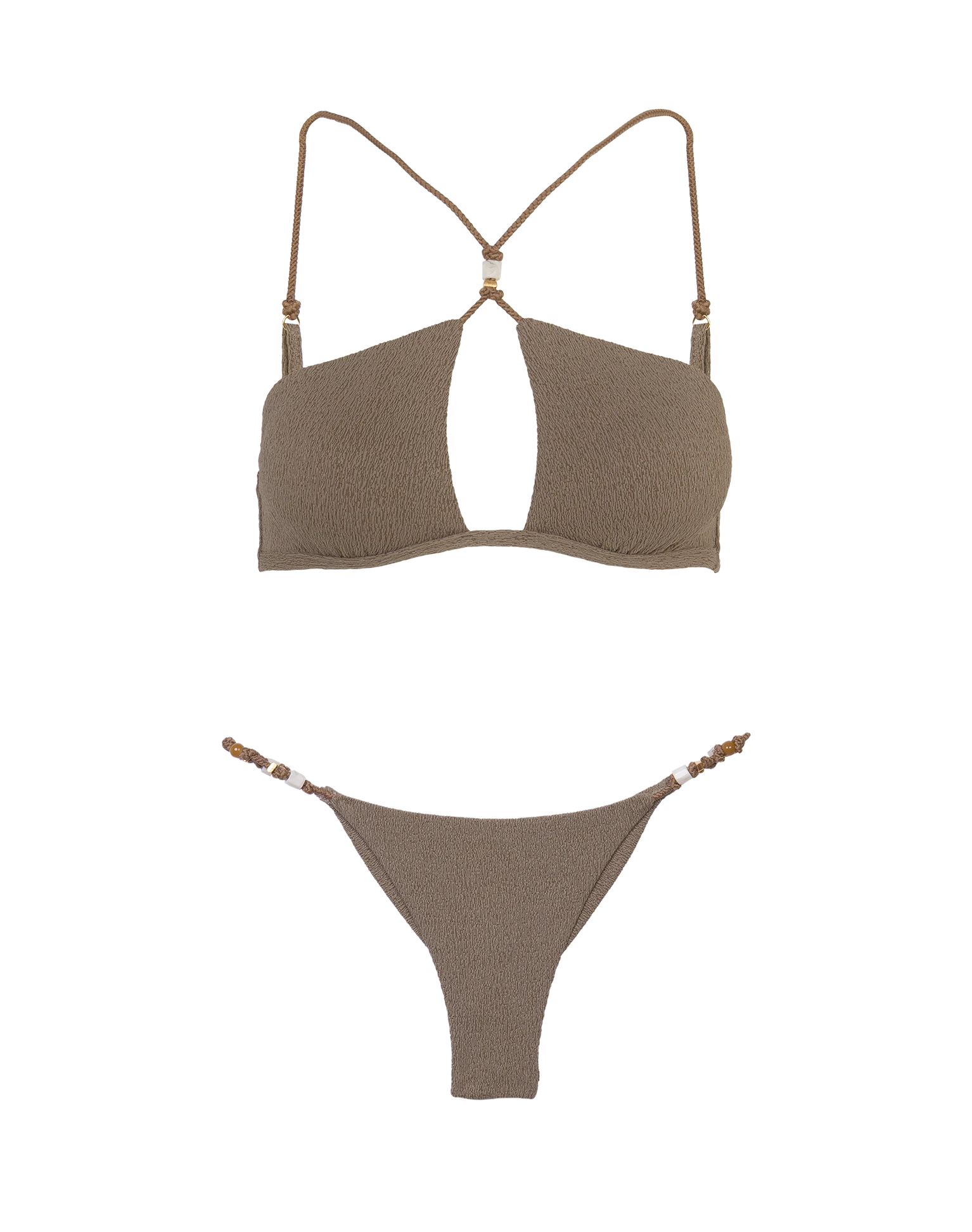 Open front top with a cut-out at the center of the bust, finished off with tortoiseshell resin and metal details, arranged in elastic cord in the same color as the fabric in a V shape on the front, that turns into parallel adjustable straps on the back.