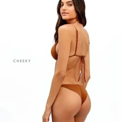 Classic bottom with elastic cord sides in neutral tone crafted in macrame and metal details.