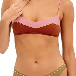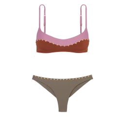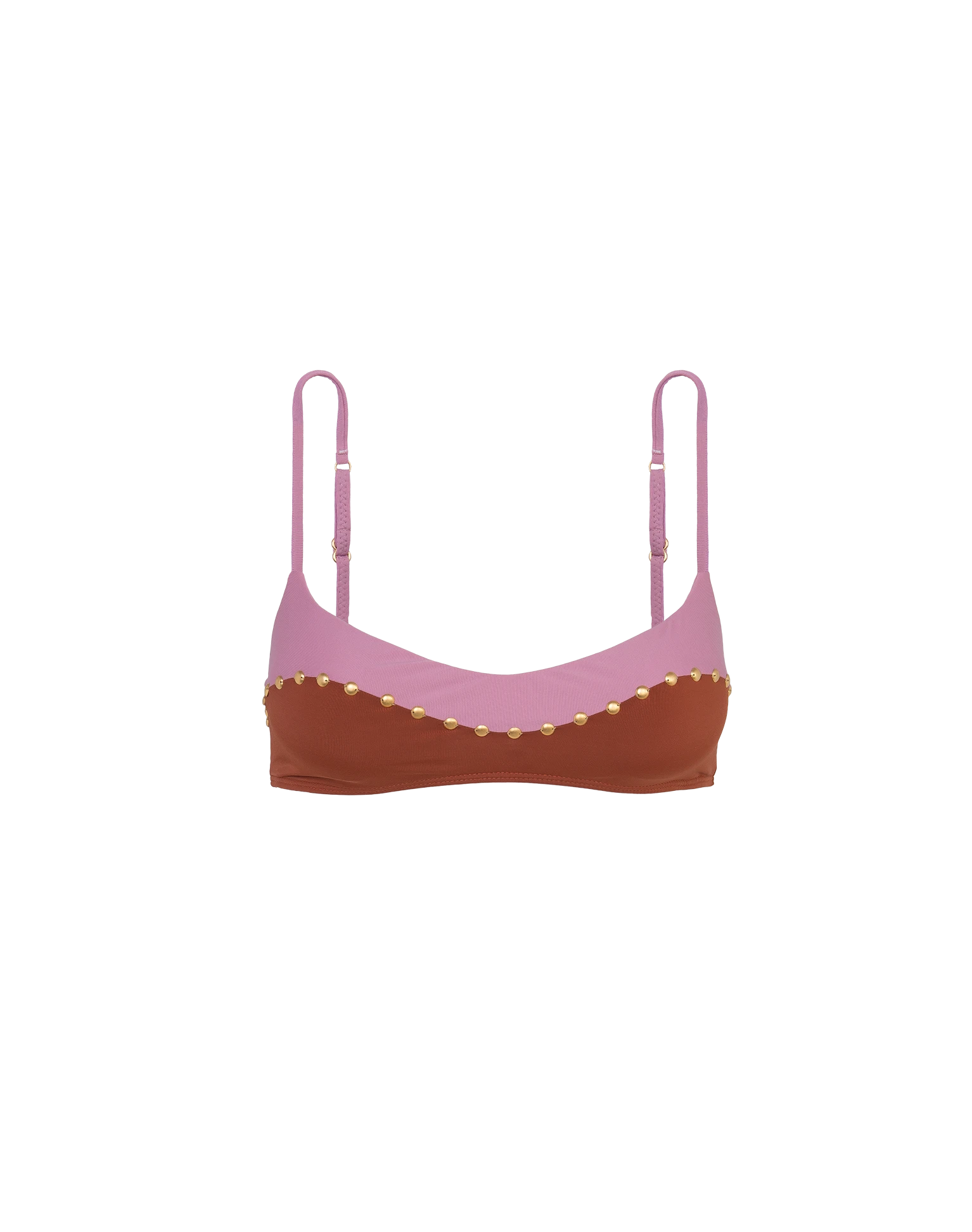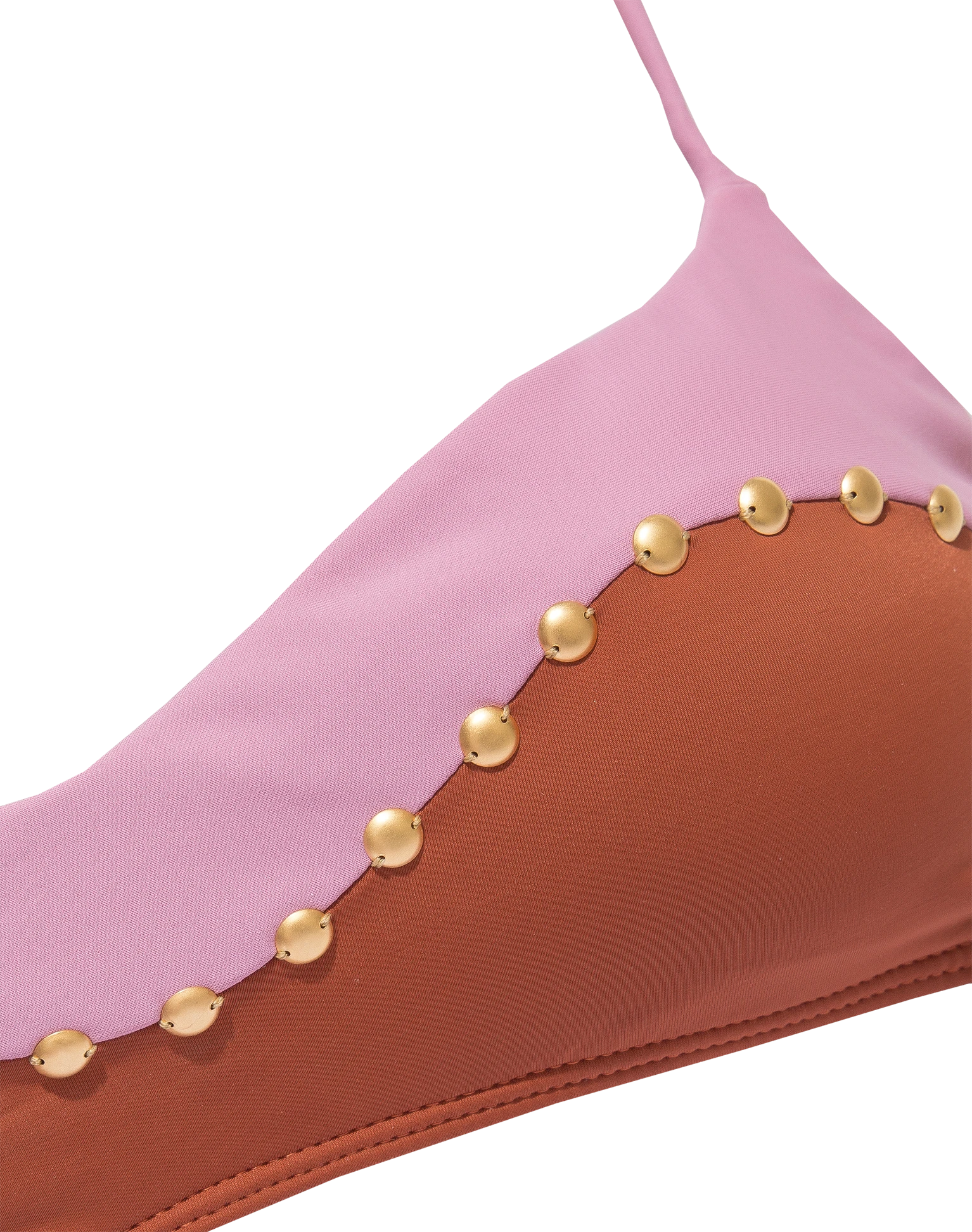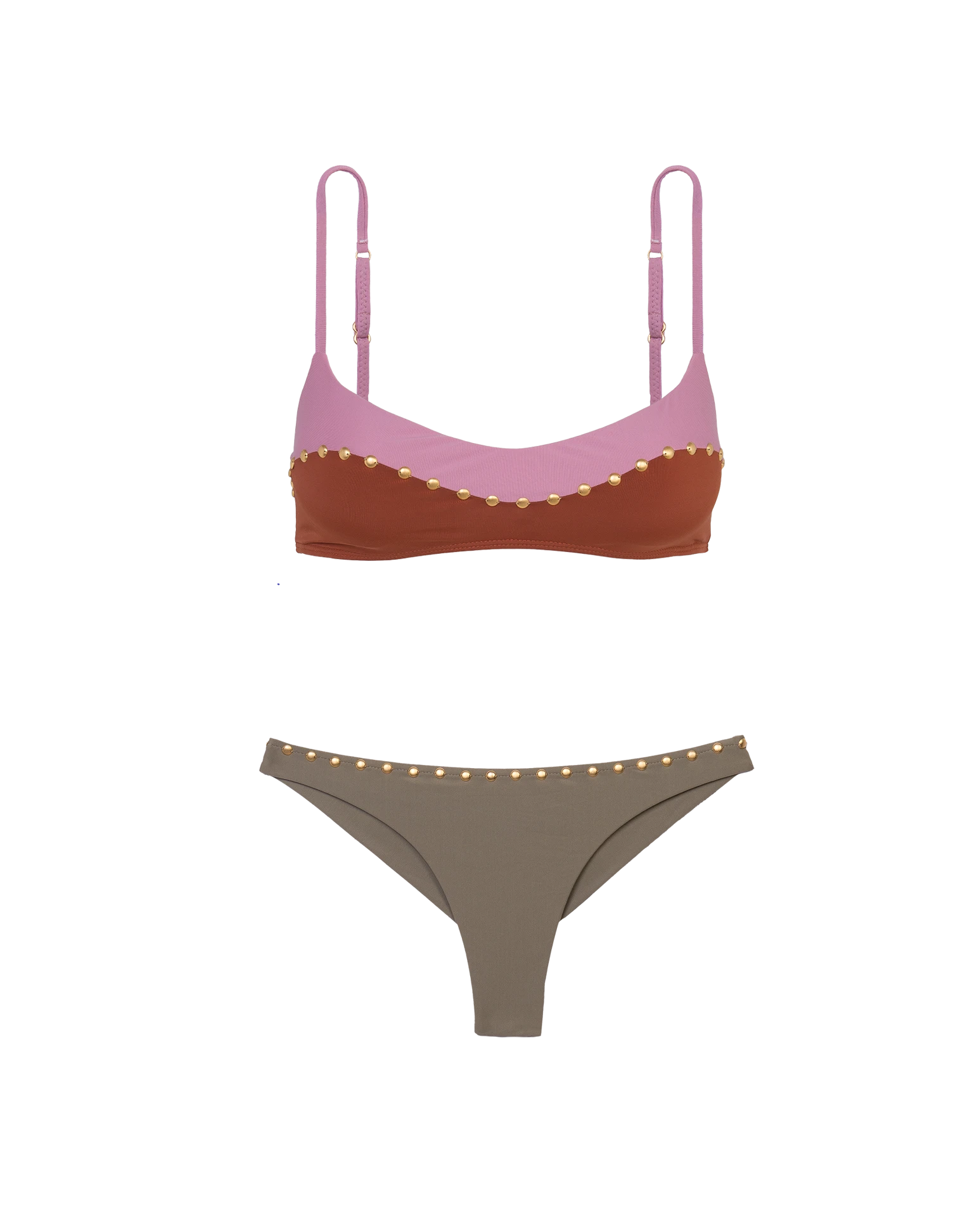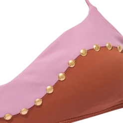 Color blocking cutouts with a combination of two monochromatic tones: above the pink Duchese and below the earthy Camel. Studded details on the front.