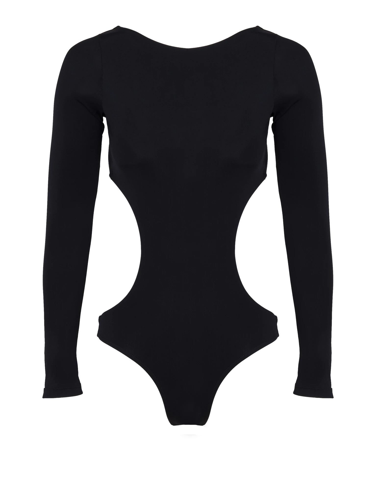 Long-sleeved one piece with opening on both sides at the waist. Leaving the entire silhouette of the waist exposed.