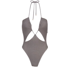 One piece with a deep V-neckline and two symmetrical cut-outs. It is finished off by a thin strap that ties at the neck. Lupita is a traditional Vichy minimal print in black and off white, It is easy to style is a great match for traditional looks.