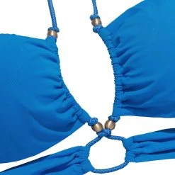 Fashion forward bikini top that embodies femininity with its curve hugging silhouette; adorned with hand-crafted 24k gold dipped charms and waxed rope center detailing. A true head turner.