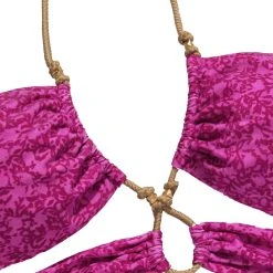 Fashion forward bikini top that embodies femininity with its curve hugging silhouette; adorned with hand-crafted 24k gold dipped charms and waxed rope center detailing. A true head turner.