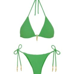 Crafted with our eco-friendly fabric featuring a delicate ribbed feel, this triangle top offers a flattering full-coverage fit. Part of the Diara group, this top includes a 24k glittering gold horn detail at the center and at the tips of the ties to sparkle up your beach day.