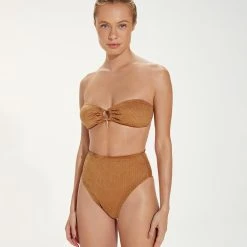 Textured high-waisted bikini bottom that provides medium coverage with a high leg on an exclusive scales texture fabric for a flattering retro look.