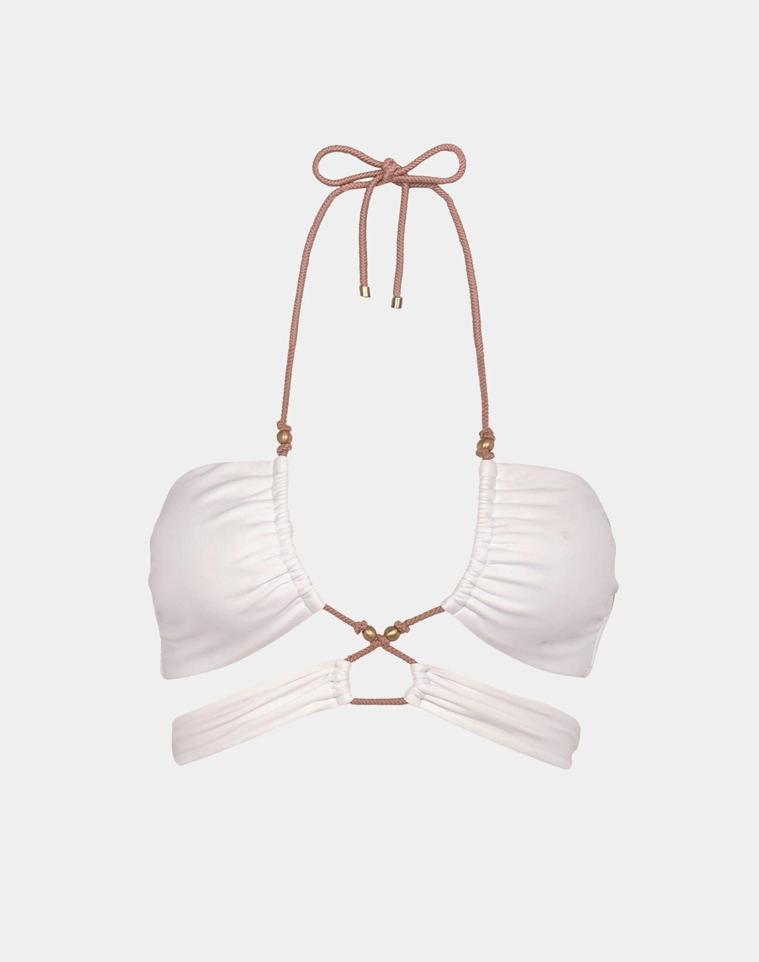 Fashion forward bikini top that embodies femininity with its curve-hugging silhouette; adorned with hand-crafted 24k gold dipped charms and waxed rope center detailing. A true head-turner.