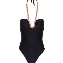 Reach the beach in style with the Carol One Piece, a versatile one-and-done halter crafted with an artisanally made trim comprised of stretchy rope-like fabric and 24k gold details. A true must for any jet setter.