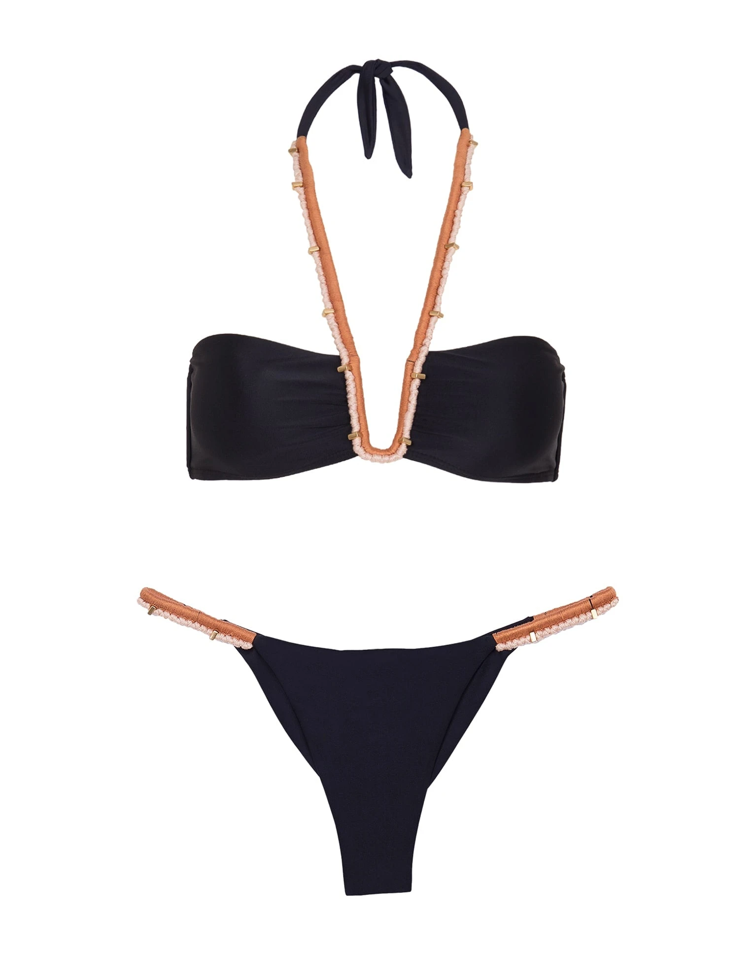 Stunning sultry bottoms shaped in our famous Brasilian lycra featuring artisanal side details with 24k gold-plated studs on an elasticized double woven rope-like trim made for you to stand-out on all your sun-filled adventures.